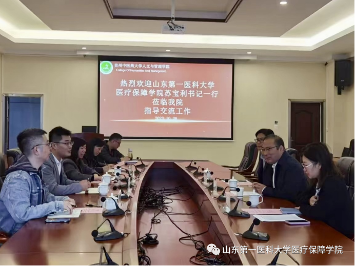 贵州中医药大学人文与管理学院院长吴小勇对苏宝利一行表示欢迎,并介绍了学院发展的历程和现状,医疗保险专业主任胡期丽做了专业介绍。苏宝利介绍了v站体育官网建设及发展情况,宋燕介绍了学科建设及科研情况,时涛介绍了医疗保险专业建设情况。双方就医疗保险专业的人才培养、专业建设、教学评估、学生就业等方面展开深入的经验交流,为共同促进双方的医疗保险专业创造了基础。