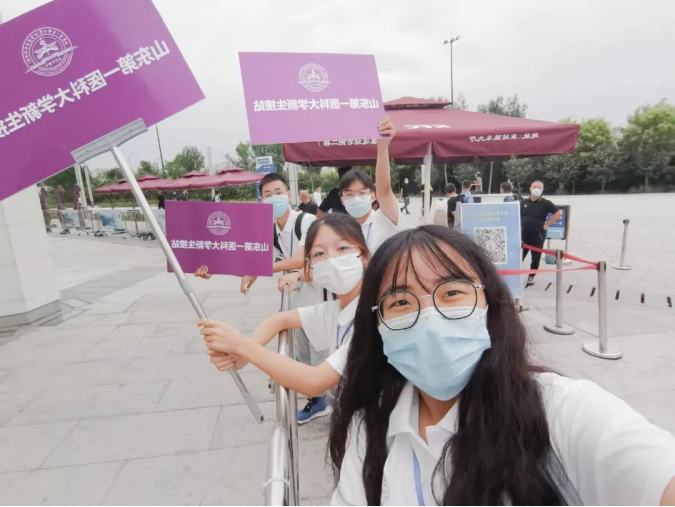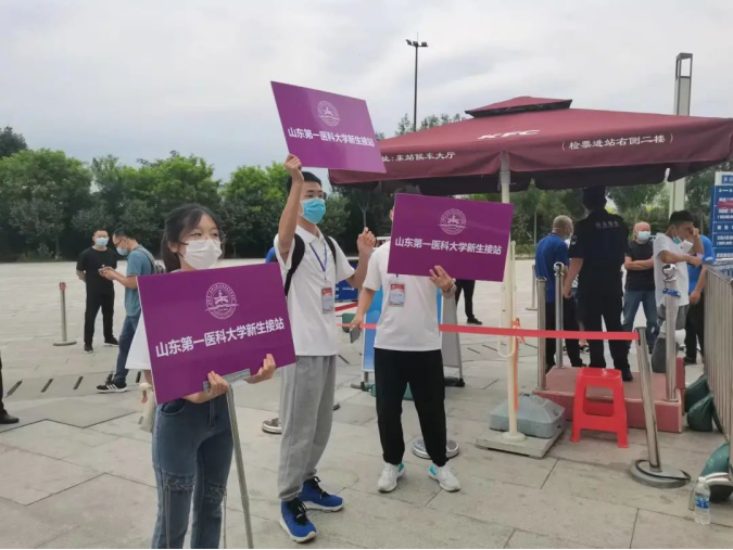 在各个车站学校也提供暖心服务,迎新志愿者们在各个站点举着校牌,等待着师弟师妹们的到来,并耐心地为他们指引。