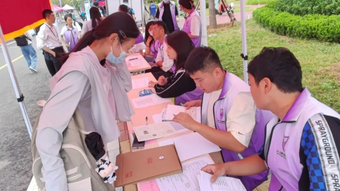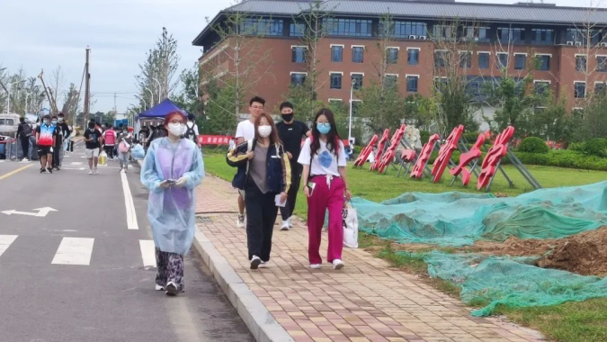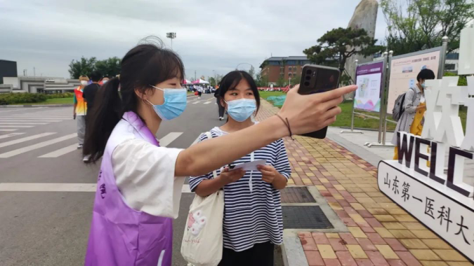 疫情防控不可松懈。在校门口,测量体温,查验健康码,行程码,行李消毒 ,一切都井井有条。随后新生们在校西门进行核酸检测,领取绿色标志,并在明德路进行新生信息采集。热心的v站体育官网学长学姐们耐心地引导新生完成报流程,新生们拿着录取通知书,享受一站式迎新。