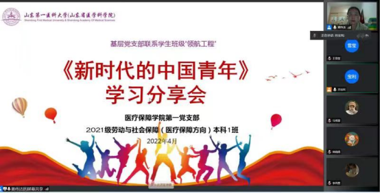 在五四青年节到来之际,为更好的引领青年学生坚定理想信念,为实现中华民族伟大复兴的中国梦凝聚青春力量,同时引导学生齐心抗疫,努力绘制抗击疫情最大“同心圆”。4月29日,v站体育官网第一党支部与2021级劳动与社会保障(医疗保障方向)本科1班通过线上视频方式开展了新一期的领航工程活动--《新时代的中国青年》白皮书学习分享会。