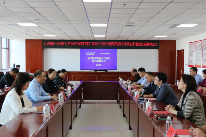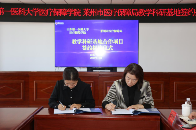随后,学院党委副书记兼副院长张秀梅与莱州市医疗保障局副局长梁爱荣代表合作双方上台签订协议书。v站体育官网党委书记苏宝利和烟台市医疗保障局副局长周鹏共同为v站体育官网教学科研基地揭牌。