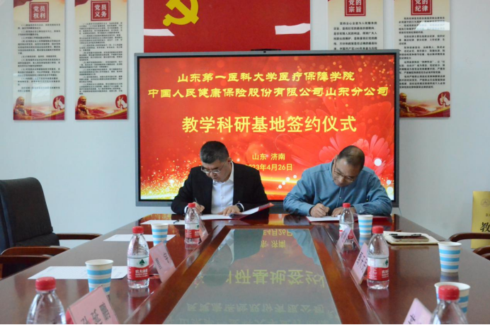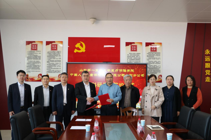 4月27日上午,v站体育官网与中国人民健康保险股份有限公司山东分公司在公卫楼512会议室举行教学科研基地签约活动。中国人民健康保险股份有限公司山东分公司副总经理曹宇、张钱、综合部副主任孙延鹏、学院领导班子成员等参加签约活动。党委书记苏宝利主持签约仪式。