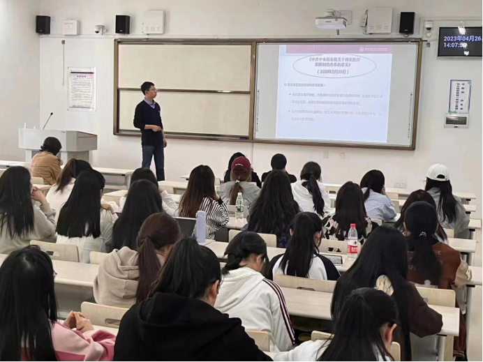 针对2022级的同学们面临专业选择,第二党支部决定以解答同学们在专业上的困惑为出发点,精心组织了本次活动。首先由支部宣传委员宋奎勐老师作了题为“医疗保障与医疗保险”的宣讲,结合中央发布的涉及医疗保障改革的重要文件,包括《中共中央 国务院关于深化医疗保障制度改革的意见》《中华人民共和国国民经济和社会发展第十四个五年规划和2035年远景目标纲要》以及党的二十大报告等,为同学们详细讲解了医疗保障与医疗保险的内涵及未来改革方向,使同学们既了解了党在医保领域的大政方针又进一步加深了对医保专业的认识。随后,支部书记韩志琰老师为同学们介绍了医疗保障与医疗保险两个专业在专业设置、培养方案、未来考研和就业方向等方面的区别和联系,并敦促同学们无论选择哪个专业都要踏踏实实地学好专业知识。