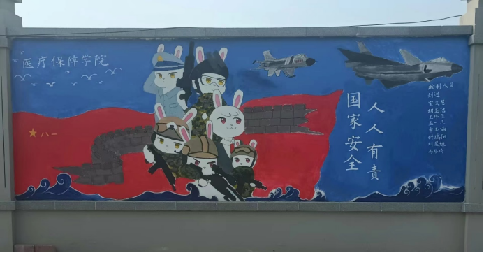 作品设计理念:顶部以蓝色喻蓝天,绘有飞机;中间绘有长城与军旗,并以讲述中国故事的动漫《那年那兔那些事》中的兔子们为主角,代表中国军人;底部绘制海浪,有大海之意。三者结合暗喻海陆空,兔子们眼神坚定,屹立如山般坚毅,守护国家安全,凸显国防安全之意。