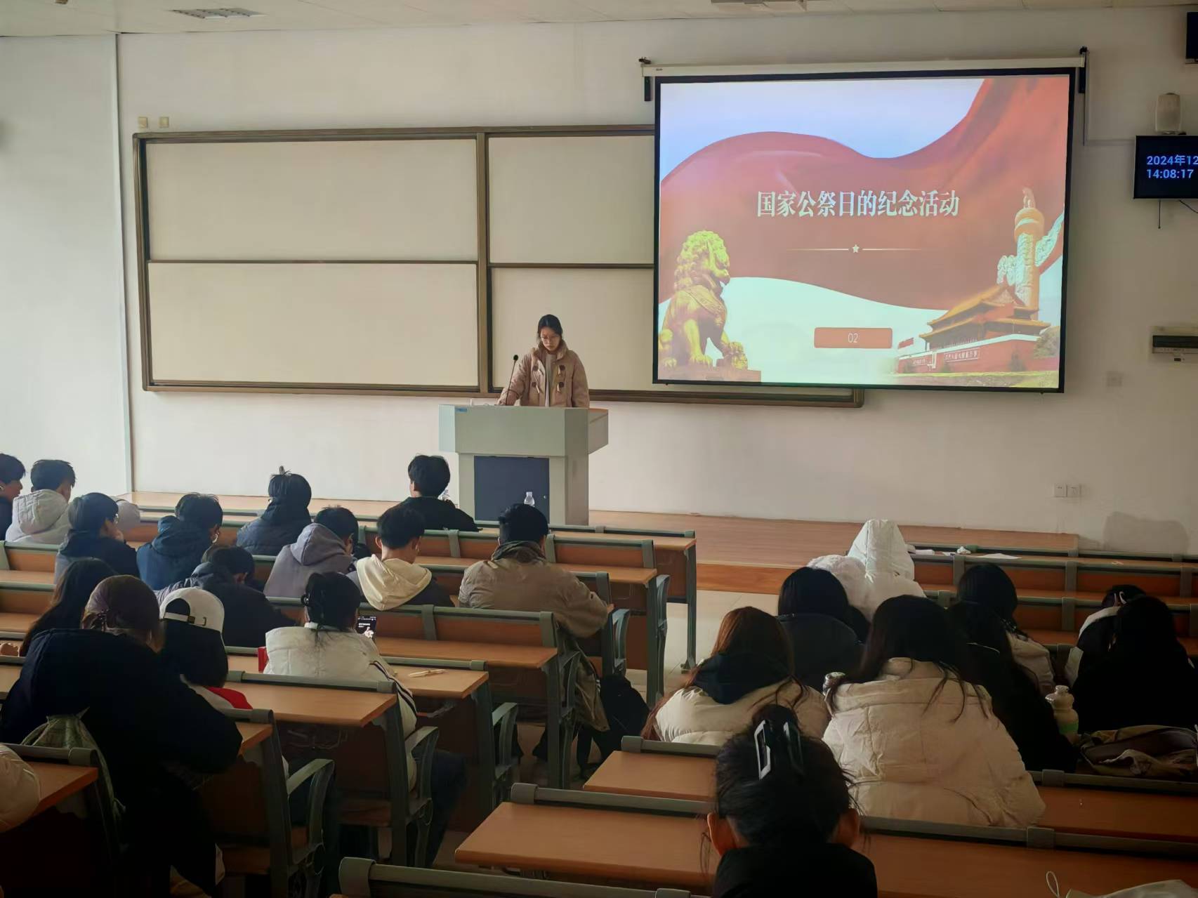 预防医学(医疗保障方向)全体学生为南京大屠杀遇难者默哀,沉痛追思。默哀结束后,同学们通过精心制作的PPT 以及纪录片,一起回顾了南京大屠杀那段黑暗的历史,随后学生代表发表演讲,呼吁同学们铭记历史、珍惜当下、展望未来。全体学生齐唱《歌唱祖国》,进一步激发了同学们的爱国热情和民族自豪感。