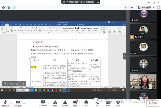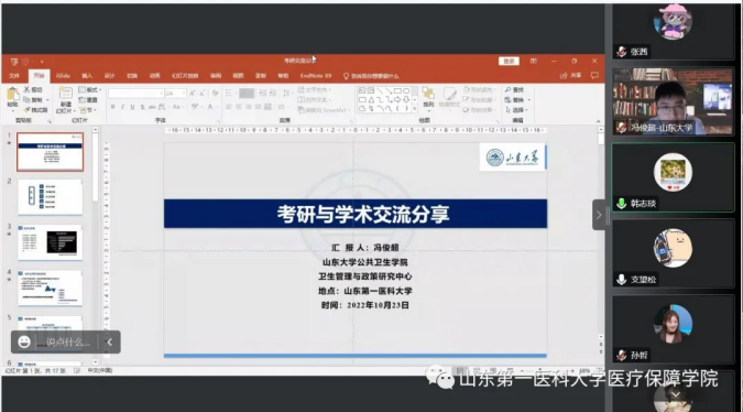 为了进一步提高我院学生的考研热情,明确考研目标,掌握相关的考研技巧,了解更多的考研信息,2022年10月23日,我院举办考研线上交流会,会议邀请了山东大学社会医学与卫生事业管理专业冯俊超博士和山东大学公共卫生专业张海琴硕士。学院副书记兼副院长张秀梅,待遇保障研究所所长韩志琰以及20级和21级同学参加会议。