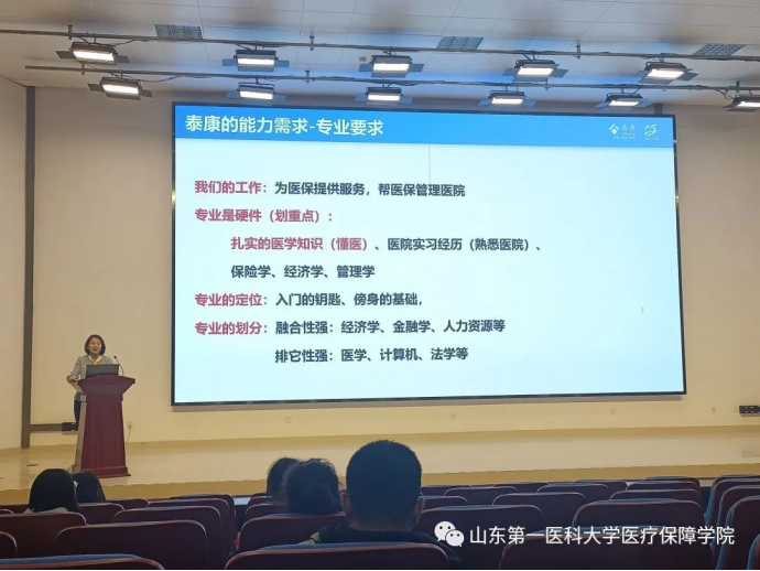 讲座伊始,张敏介绍了泰康集团的情况,重点介绍了在保险、资管、医养等板块取得的显著成绩。接着,又介绍了中国保险行业的发展,健康产业的变革与创新,中国特色医疗保障体系建设以及社会对人才的能力需求。最后从医疗保险发展的角度把职业规划分为舞台和能力两方面,强调同学们应在大学四年努力提升自己的专业能力、管理能力、人际沟通能力。随后,张敏与同学们进行深入交流,对同学们关于的医保问题进行答疑解惑。