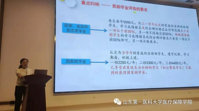 8月31日晚,学工部副部长刘玉给新生们开展资助政策教育。刘部长对国家资助政策进行了解读,包括国家奖学金、国家励志奖学金、国家助学金、国家助学贷款、勤工助学、绿色通道等。随后,刘部长具体介绍了校(院)对家庭经济困难学生的资助体系,就家庭经济困难学生认定工作程序做了进一步说明。
